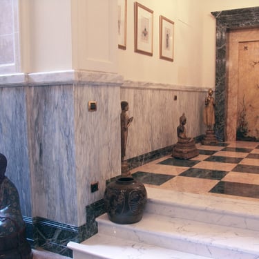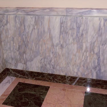 The walls, panels, and architectural details were finished using hand-painted faux-marble techniques, delivering the depth, veining, and luminosity of real stone.
